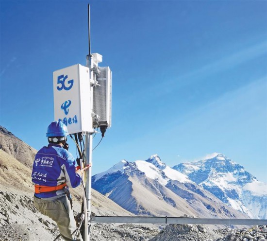 圖為網(wǎng)絡(luò)維護(hù)人員在珠穆朗瑪峰景區(qū)進(jìn)行5G網(wǎng)絡(luò)檢測和提升。記者 陳林 汪純 攝