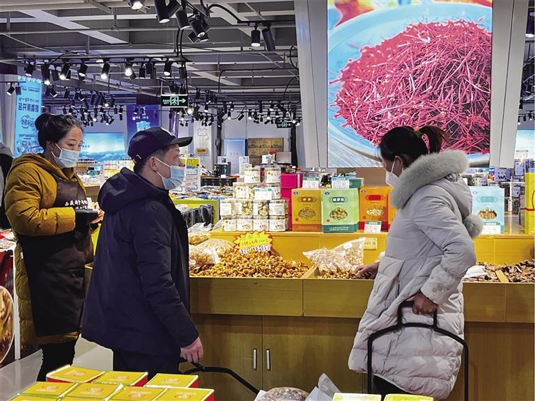 1月9日,記者來到西藏特產(chǎn)倉儲超市(乃倉店)進(jìn)行實地走訪。走進(jìn)超市,牦牛肉干、藏紅花、藏香豬肉、酥油茶、靈芝孢子粉等數(shù)百種西藏特產(chǎn)讓人眼花繚亂。雖是工作日,但前來購買特產(chǎn)的市民絡(luò)繹不絕?!榜R上過年了,想挑選一些西藏特產(chǎn)帶回去?!鼻皝碣徺I特產(chǎn)的李女士說,“今天主要買了西藏本地產(chǎn)的蟲草酒和藏蜜,送長輩很合適?!?/p>