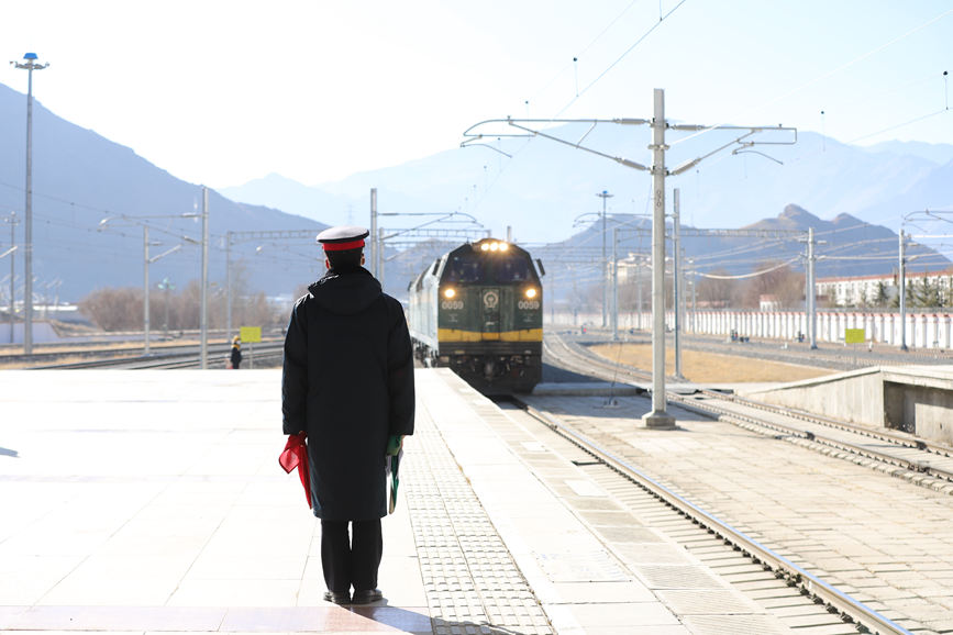 伴隨著一圈一圈揮動(dòng)的信號(hào)旗,列車緩緩駛出拉薩站。目送著列車安全、準(zhǔn)時(shí)地駛離后,全海文收攏信號(hào)旗又大步向站臺(tái)另一端走去。