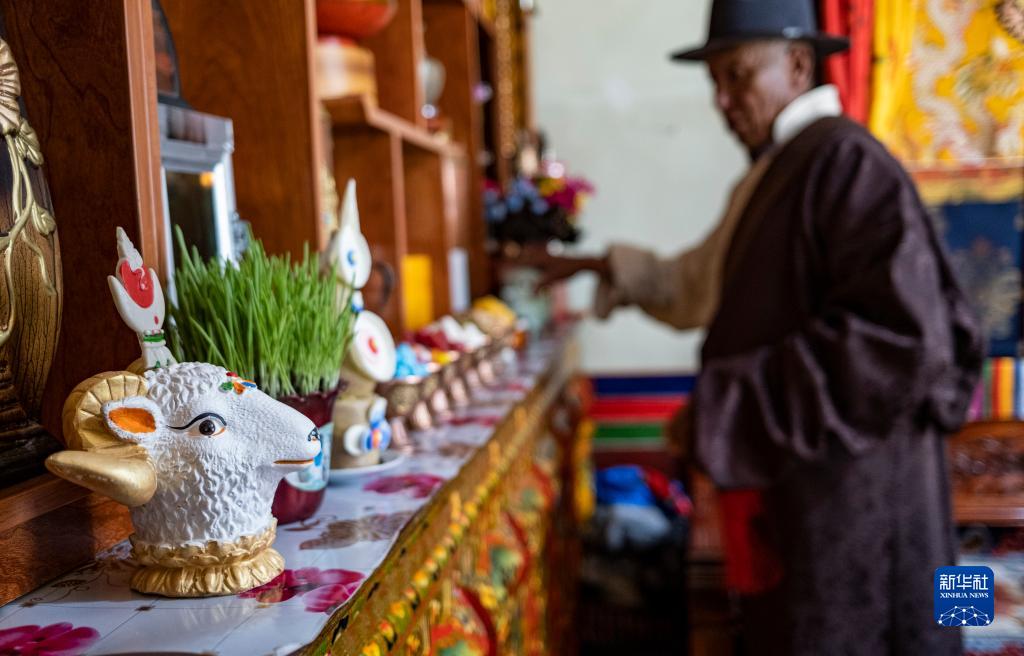 2月20日,在位于西藏拉薩市墨竹工卡縣門巴鄉(xiāng)的家中,扎西次仁用五彩青稞穗裝點(diǎn)象征吉祥的“切瑪”。新華社發(fā)(丁增尼達(dá) 攝)