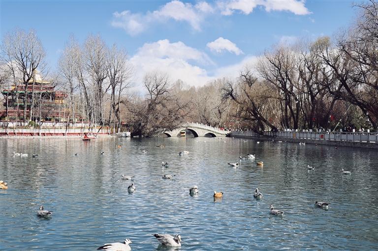 距離羅布林卡3.6公里的宗角祿康公園,位于布達(dá)拉宮的背后,同樣深受拉薩市民群眾的喜愛,相較于羅布林卡,這里更為熱鬧。每到3月份,公園里的桃花、紅葉李、海棠競相綻放,在湖水的映襯下顯得嬌俏動人。公園內(nèi)每隔一段距離便有涼亭、長椅供人們休息賞景,在這里,人們賞花、拍鳥,格外熱鬧。