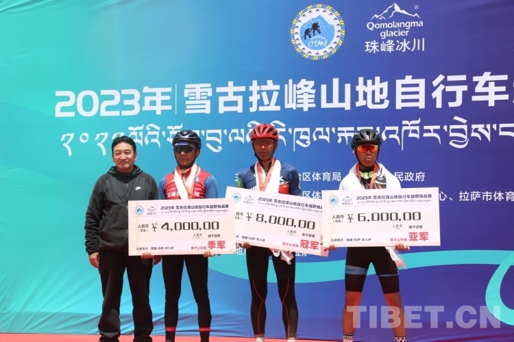 圖為獲得男子精英組冠軍西藏亞車隊選手江村羅布、亞軍西藏亞車隊扎頓、季軍拉薩朋友車隊選手索朗 攝影:德吉卓瑪