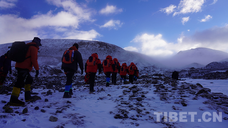 當天凌晨4點,西藏拉薩市當雄縣羊八井鎮(zhèn)周圍還是一片寂靜之時,參加洛堆峰登山探險活動的山友們已從羊八井高山訓練基地出發(fā)前往洛堆峰登山探險。經過長達7小時30分左右的長途跋涉,第一批登山人員成功登頂海拔6010米的洛堆峰,此時金色的太陽早已籠罩大地,白皚皚的雪山聳立在大地之上,在陽光的照耀下顯得格外壯觀。