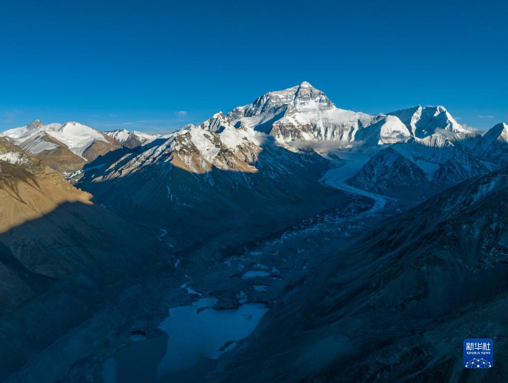 這是日落時(shí)分的珠峰和絨布冰川(5月16日攝,無人機(jī)照片)。新華社記者 晉美多吉 攝