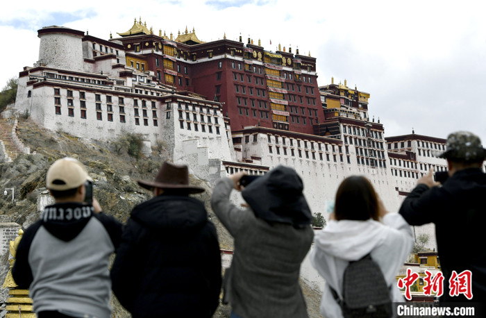 5月19日,游客在西藏拉薩布達(dá)拉宮觀景臺(tái)拍照留念。5月的拉薩初夏,草木漸茂、綠樹成蔭,雨量充沛、濕度適宜,日光充盈卻少了一絲燥熱,成為了眾多游客選擇進(jìn)藏的最佳時(shí)節(jié)。 中新社記者 李林 攝