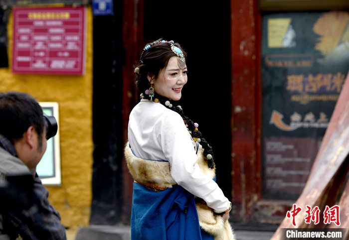 5月19日,游客身著民族特色的服裝在拉薩八廓街拍照留念。5月的拉薩初夏,草木漸茂、綠樹成蔭,雨量充沛、濕度適宜,日光充盈卻少了一絲燥熱,成為了眾多游客選擇進(jìn)藏的最佳時(shí)節(jié)。 中新社記者 李林 攝