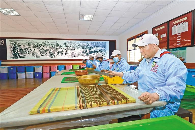 西藏藏香知名品牌優(yōu)·敏芭藏香加工企業(yè)的員工在生產(chǎn)藏香。