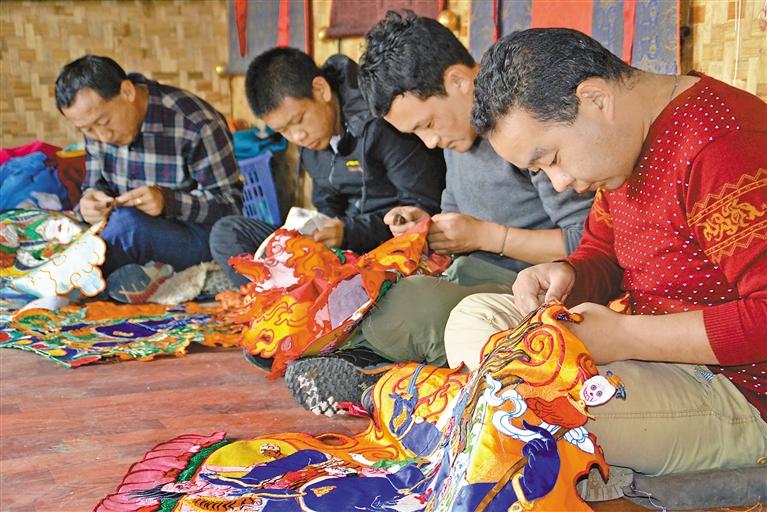 刺繡藝人巴桑(右)在制作刺繡唐卡。
