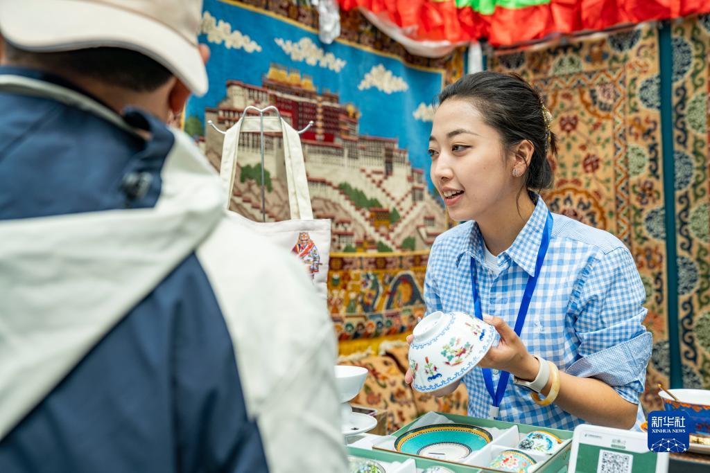 展會上的不丹商人向顧客銷售不丹服裝和木碗(6月18日攝)。新華社記者 晉美多吉 攝