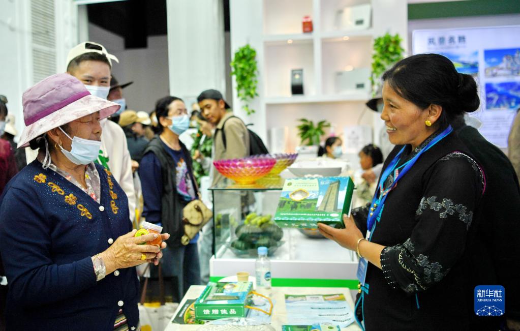 在藏博會上,來自西藏昌都市的參展商(左)向顧客推介產(chǎn)品(6月17日攝)。新華社記者 張汝鋒 攝