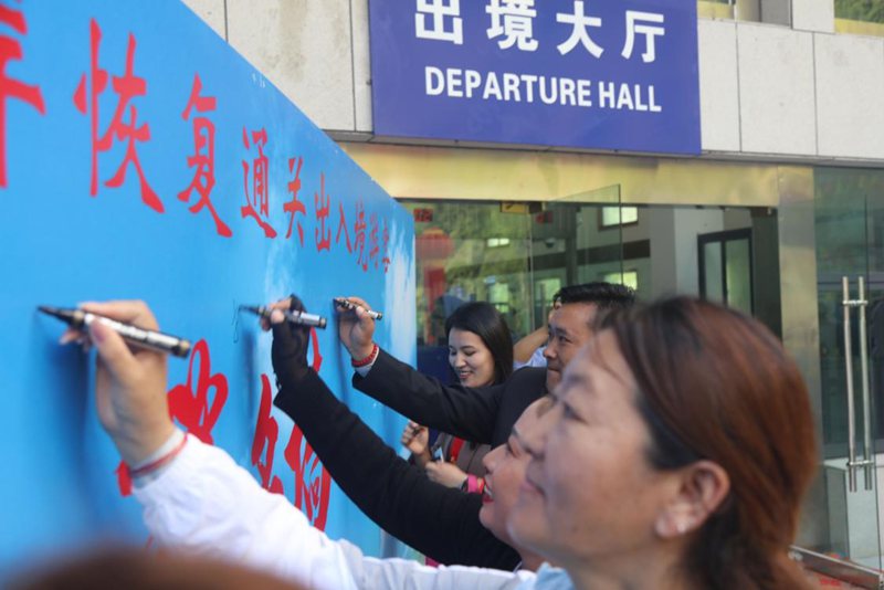 出入境人員在墻上寫下祝福語。索朗次仁攝