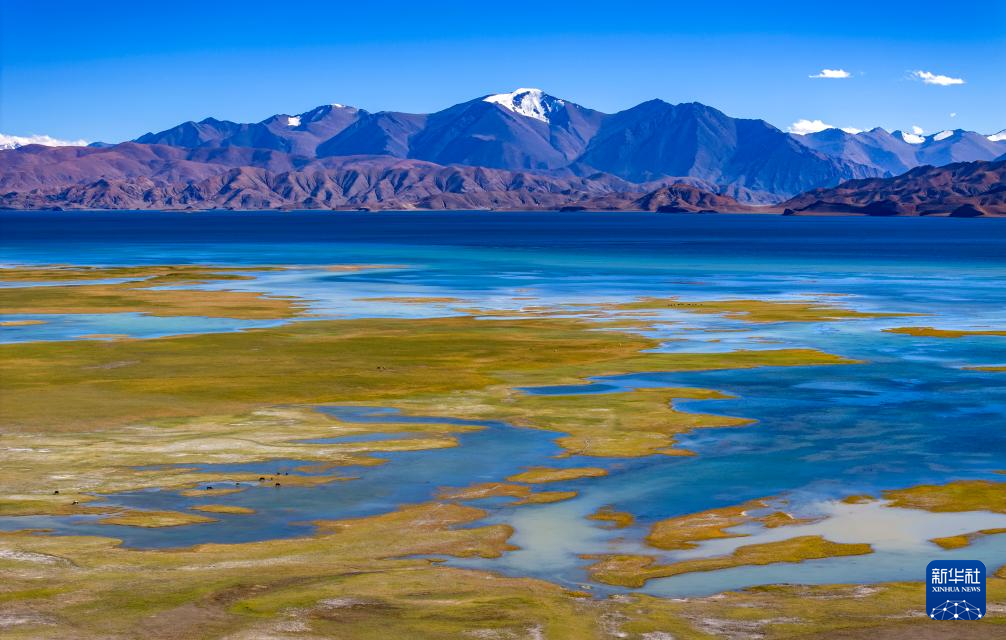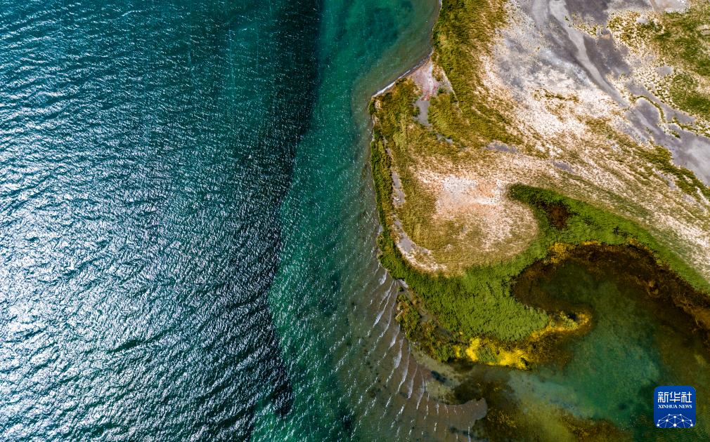 鳥瞰班公湖畔的濕地(無人機照片,9月21日攝)。新華社記者 姜帆 攝