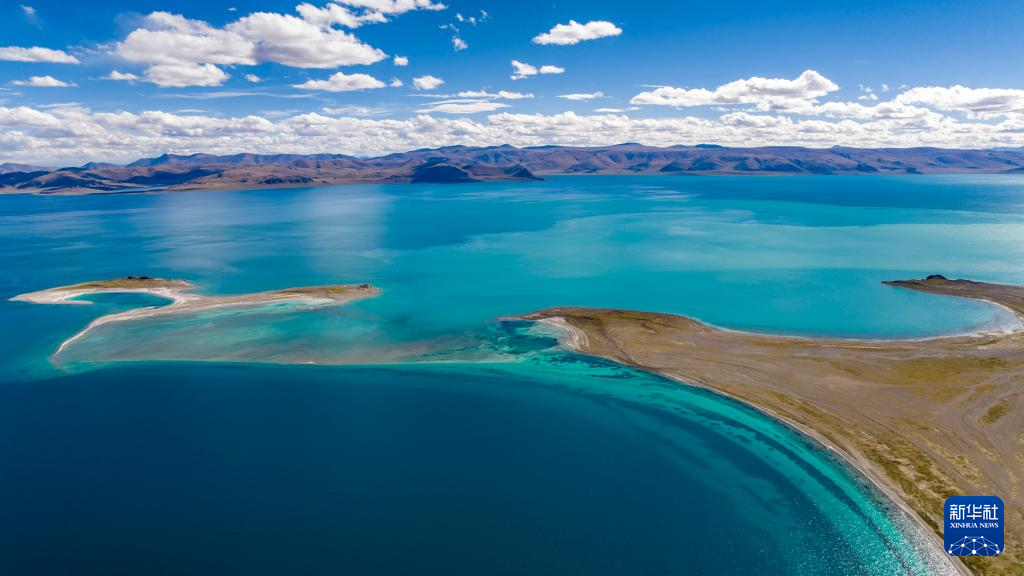 位于改則縣物瑪鄉(xiāng)的物瑪錯(cuò)因水位下降被沙洲一分為二,湖面呈現(xiàn)不同顏色(無人機(jī)照片,9月24日攝)。新華社記者 姜帆 攝