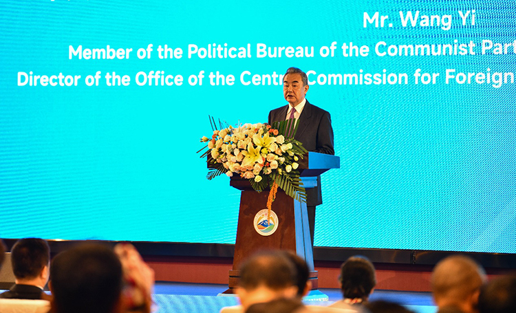 圖為開幕式暨主旨論壇現(xiàn)場(chǎng)中共中央政治局委員、中央外事工作委員會(huì)辦公室主任、外交部部長(zhǎng)王毅在致辭 攝影:新華社記者晉美多吉