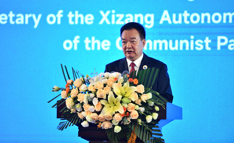 西藏自治區(qū)黨委書記王君正致辭,西藏自治區(qū)黨委副書記、自治區(qū)主席嚴(yán)金海宣布論壇開幕。