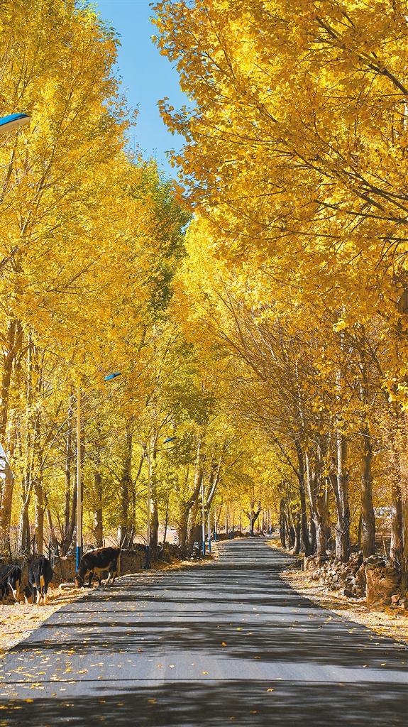 不僅如此,不管是往北通向唐嘎鄉(xiāng)的路,還是往南通向章多鄉(xiāng)的路,或是通往各個(gè)村莊的路,都在爭先恐后地訴說著金秋的美麗。道路兩旁聳立著金黃色的楊樹,陽光透過樹葉,散落在道路上,一種靜謐而淡然的美,劃過車窗。
