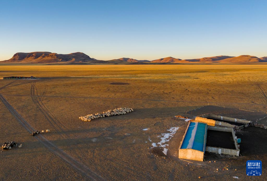 太陽落山,丹增家的羊回到棚圈。其中左側(cè)藍(lán)頂?shù)氖侨ツ晷律w的封閉式棚圈,右側(cè)是傳統(tǒng)的敞開式羊圈(無人機照片,12月18日攝)。新華社記者 姜帆 攝