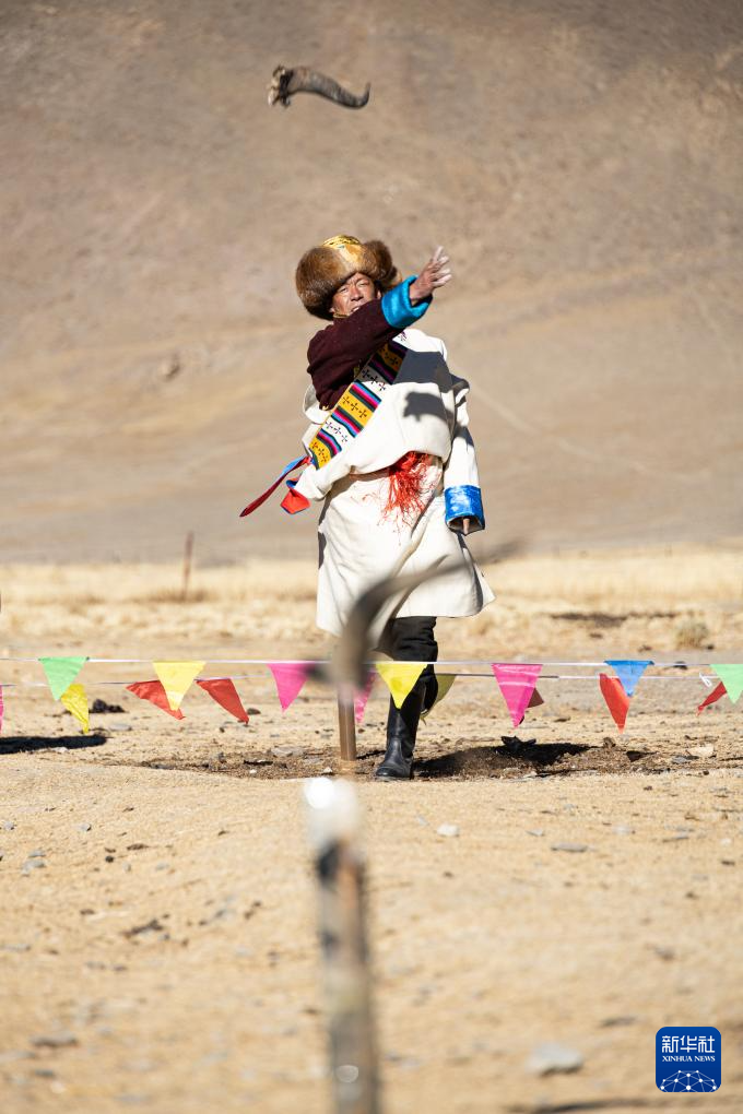 思古龍村的一位村民在投擲牛角(1月13日攝)。新華社發(fā)(丁增尼達(dá) 攝) ??
