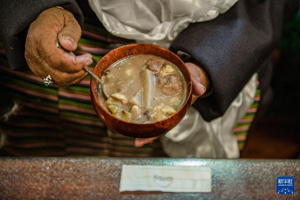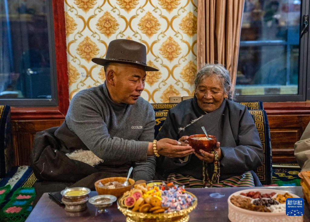 在位于西藏拉薩市當(dāng)雄縣公塘鄉(xiāng)甲根村的家中,斯曲旺姆的兒子索朗羅達(dá)為母親端上“古突”(2月8日攝)。新華社記者 孫非 攝 ??