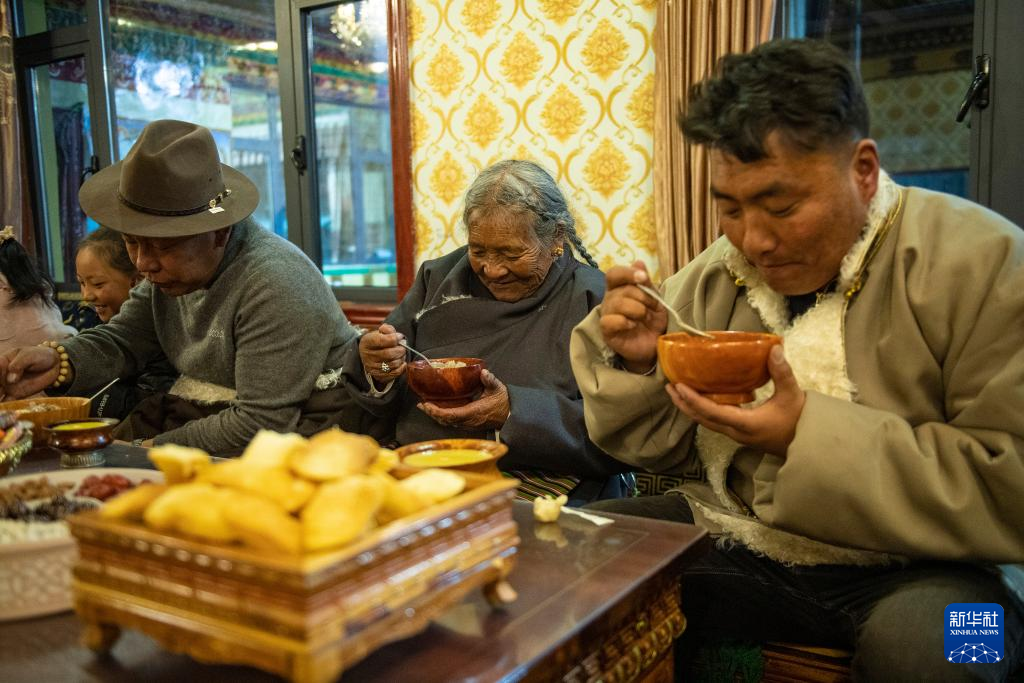 在西藏拉薩市當(dāng)雄縣公塘鄉(xiāng)甲根村,整個(gè)村子沉浸在節(jié)日氣氛中。村里的斯曲旺姆老人家四世同堂,房屋寬敞明亮。手里捧著盛滿(mǎn)“古突”的木碗,斯曲旺姆老人希望這樣的幸福能長(zhǎng)長(zhǎng)久久。 ??