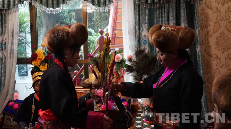圖為次仁德瓊的大女兒其米曲宗正在向莫啦古桑白姆遞上“卓瑪摘絲”。 攝影:張曉琪