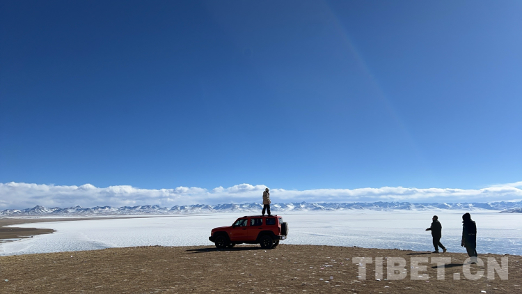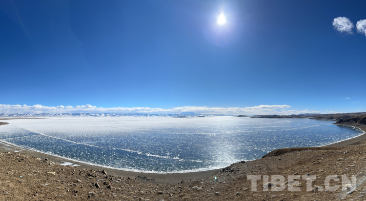 爬上一座山丘,視野陡然明亮開(kāi)闊起來(lái)。原本土黃色的藏北天然牧場(chǎng)高低起伏,黑牦牛零星地散落在山坡,登上高處后,天際圣境納木錯(cuò)便映入眼簾。初春時(shí)節(jié)的拉薩依然春寒料峭,納木錯(cuò)的落雪還未完全消融,站在高處俯視,這片安靜的大湖被陽(yáng)光反射得白茫茫一片。更幸運(yùn)的是碰到了晴好的天氣,白云與湖冰相襯,亦與遠(yuǎn)山相接,視線(xiàn)盡頭的念青唐古拉山脈直視無(wú)礙,畫(huà)面猶如“半池白云半池玉”般頗具美感。
