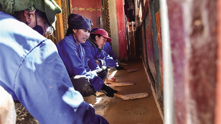 5名藏族女工一邊唱著歌,一邊用手中的工具“帛多”夯打著腳下的碎石和泥土,木棒夯土的聲音是節(jié)奏,歌聲與步調(diào)統(tǒng)一,她們一輪又一輪地合唱著。在不間斷地敲打地面數(shù)小時(shí)后,石子狀的“阿嘎”被打成平地。達(dá)桑告訴記者,這是泥匠組在通過“打阿嘎”對(duì)布宮地面有裂縫的地方進(jìn)行修補(bǔ)。