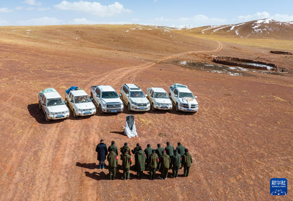 野生動物專業(yè)管護(hù)隊員在無人區(qū)深處的羅布玉杰烈士紀(jì)念碑前默哀致敬。羅布玉杰2002年在與盜獵分子的槍戰(zhàn)中犧牲(無人機照片,5月10日攝)。新華社記者 姜帆 攝