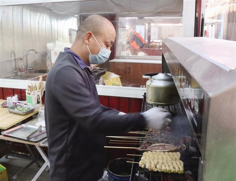 炒粉伴著滋啦作響的油爆聲在鍋中“跳躍”,燒烤師傅撒下的孜然和辣椒裹滿肉?!坏赖烂朗吃诔载泜兤谂蔚哪抗庵猩献溃瑏硪槐?zhèn)汽水或冰啤酒,盛宴就此開始……