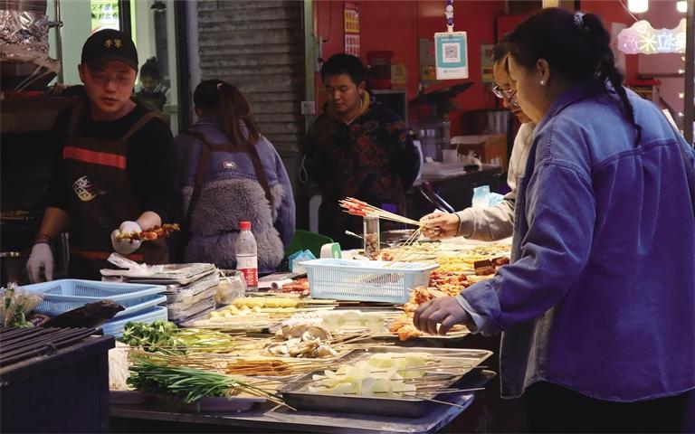“在明亮寬敞的商場里逛得有些審美疲勞,但又實在留戀夏夜的舒適,所以才來到商場外的金街上,在大大小小的宵夜攤前一邊品嘗著各種美食,一邊談天說笑,感受獨屬于鬧市的人間煙火?!笔忻襁_珍開心地說?!?/p>