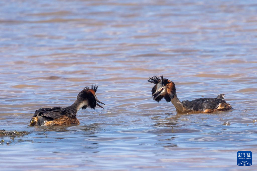 時值初夏,一群鳳頭鸊鷉在西藏自治區(qū)那曲市申扎縣下過鄉(xiāng)格仁錯旁邊的濕地營巢孵卵,準備迎接新生命的誕生。