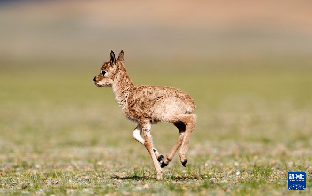 6月17日,在魯確塘草原上,一只剛出生不久的小藏羚羊跟著羊群奔跑。新華社記者 費(fèi)茂華 攝??