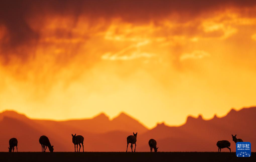 晚霞中魯確塘草原上待產(chǎn)的藏羚羊(6月16日攝)。新華社記者 費(fèi)茂華 攝