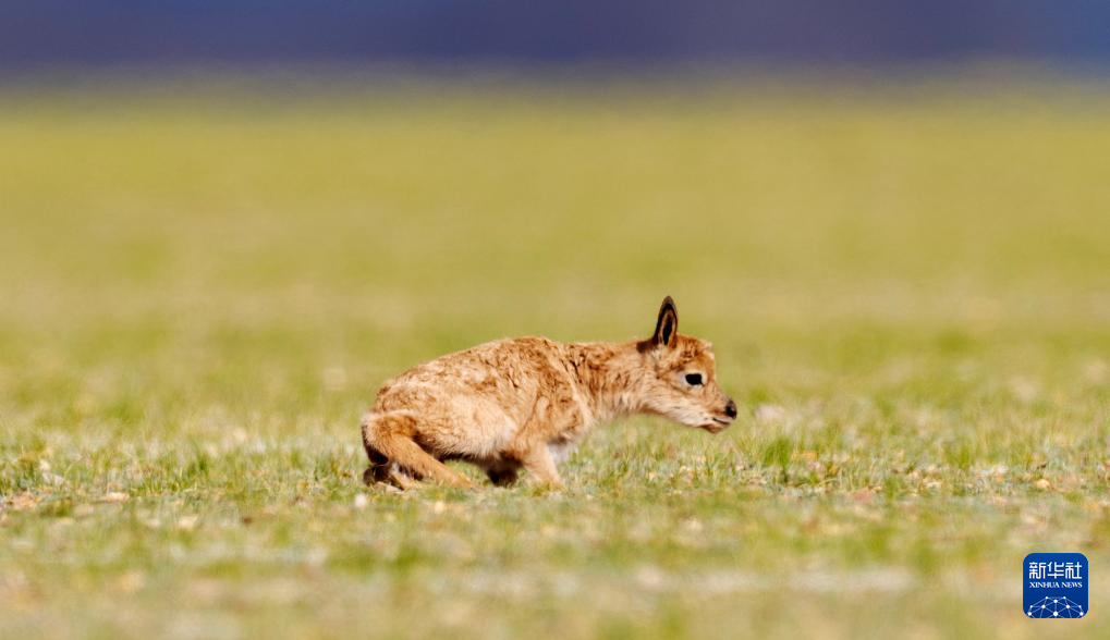 小藏羚羊在魯確塘草原上奔跑著(6月17日攝)。新華社記者 普布次仁 攝