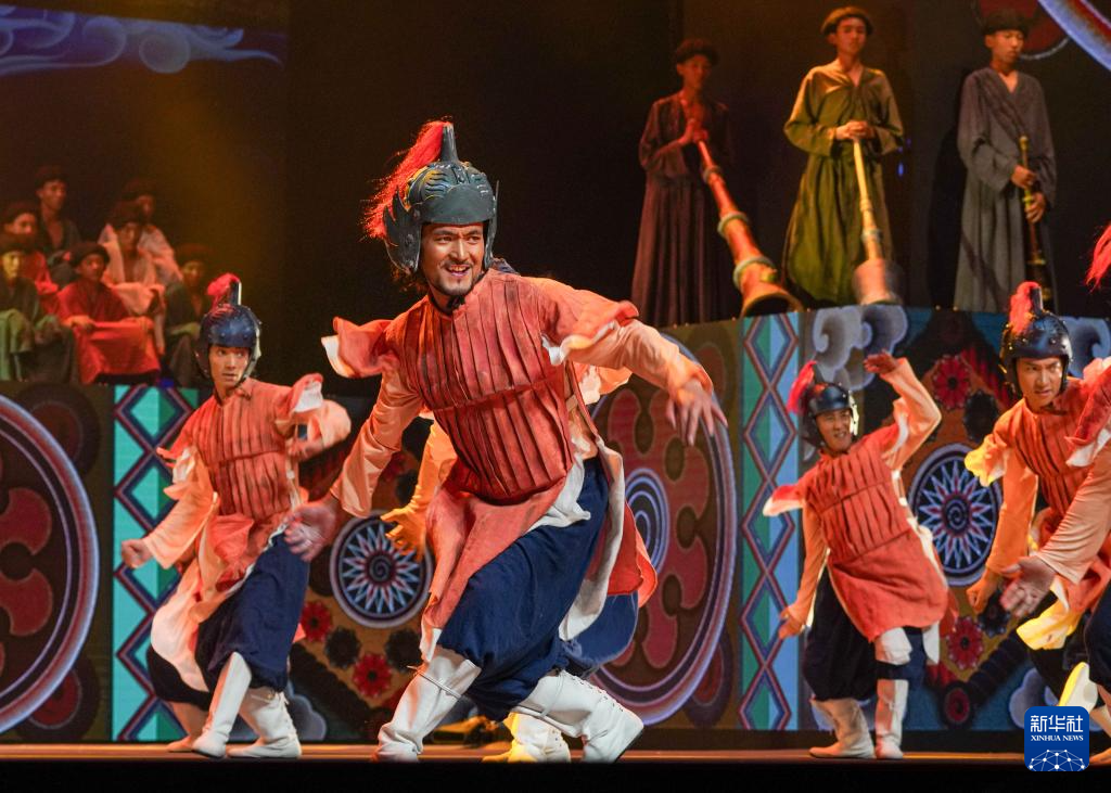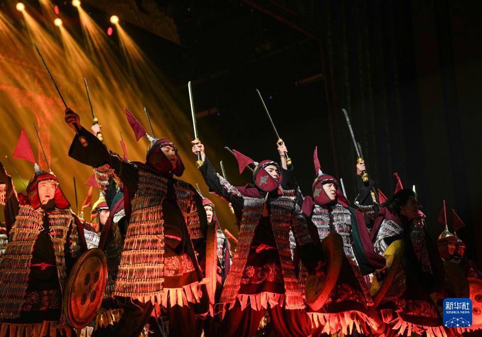 7月19日,在西藏拉薩《緣起象雄·古格遺風》情景歌舞詩演出現(xiàn)場,演員在表演節(jié)目《勇士戰(zhàn)舞》。新華社發(fā)(格桑雍珍 攝)  ??
