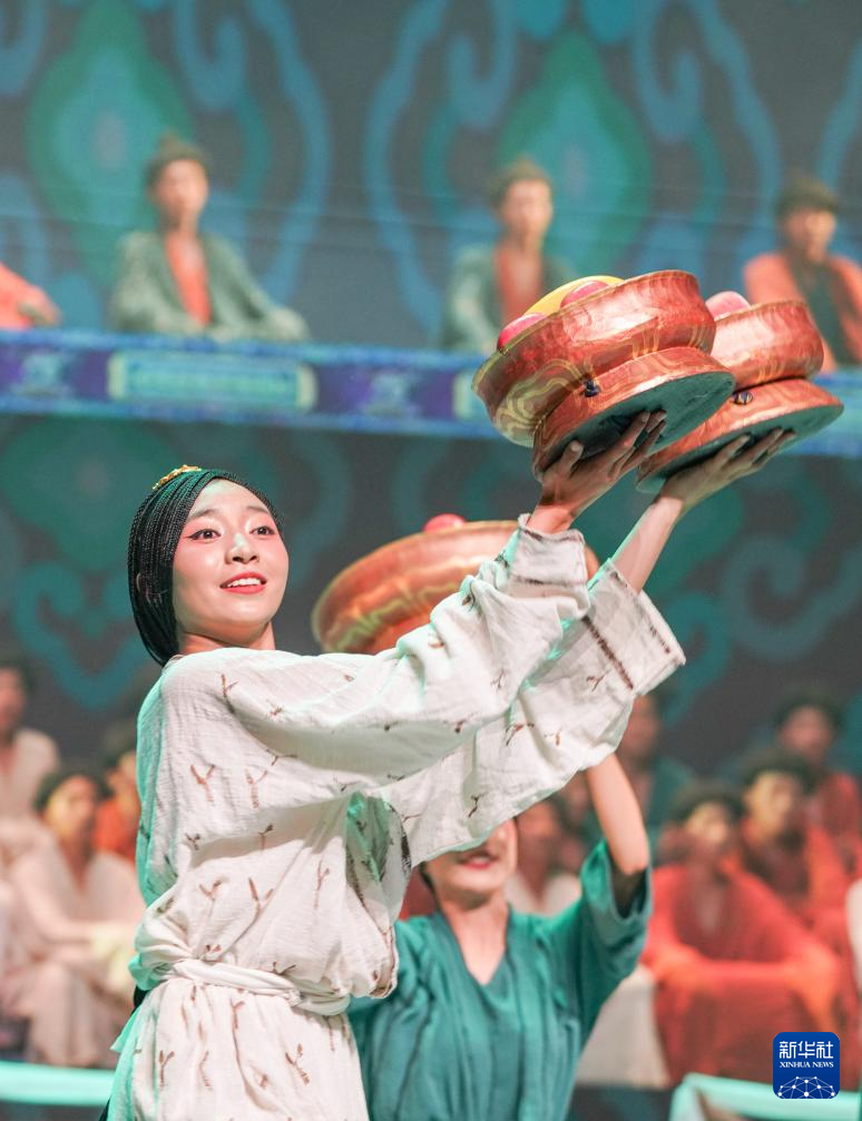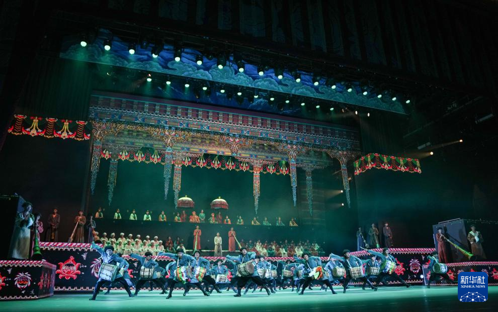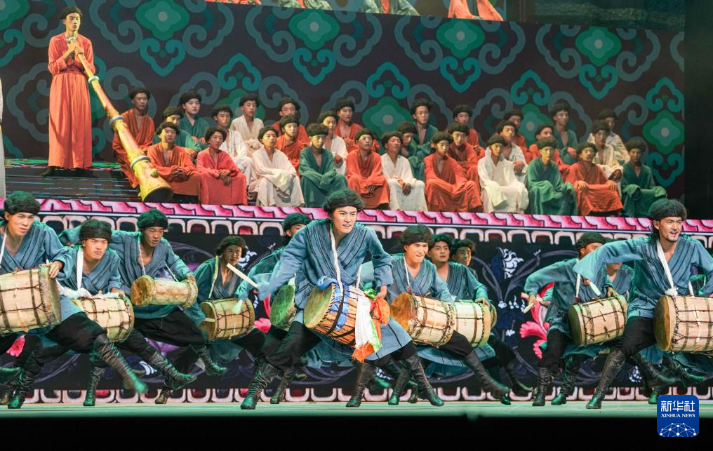 7月19日,在西藏拉薩《緣起象雄·古格遺風》情景歌舞詩演出現(xiàn)場,演員在表演節(jié)目《鼓樂喧天》。新華社發(fā)(格桑雍珍 攝)  ??