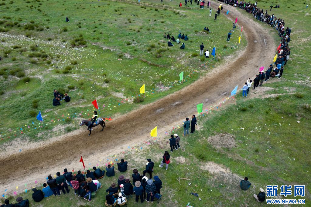 西藏林芝市林芝鎮(zhèn)第七屆尼洋旅游文化之民俗賽馬藝術(shù)節(jié)活動現(xiàn)場(7月22日攝,無人機照片)。新華網(wǎng) 旦增努布 攝