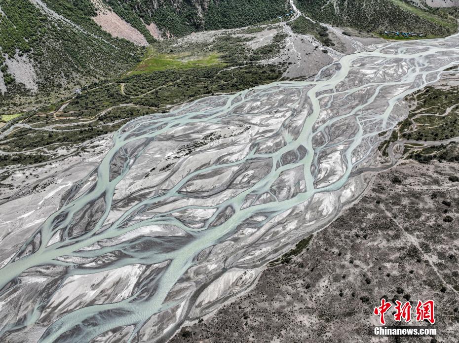 圖為三色湖旁邊的冰雪融化的河流。(無人機照片)中新社記者 貢嘎來松 攝