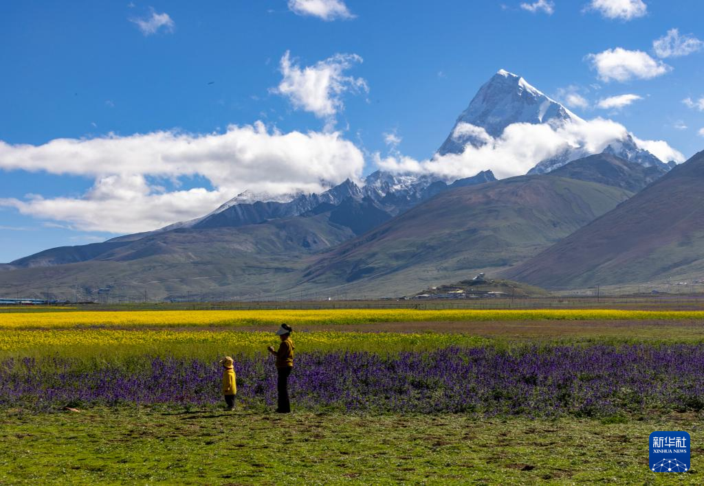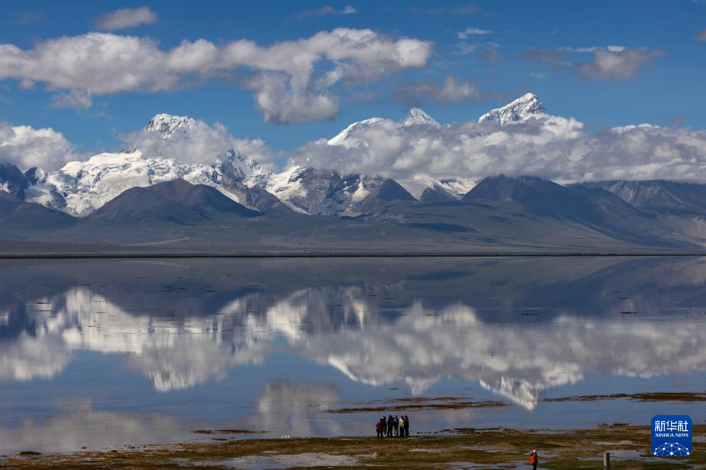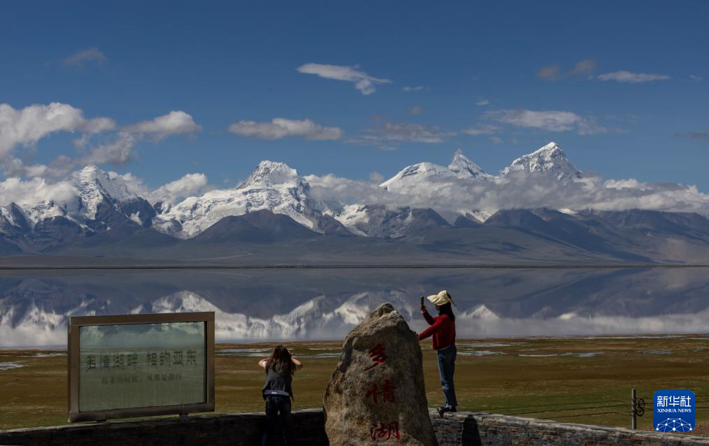 8月1日,游人在多慶錯(cuò)國(guó)家濕地公園拍攝卓木拉日雪山。新華社記者 姜帆 攝 ??