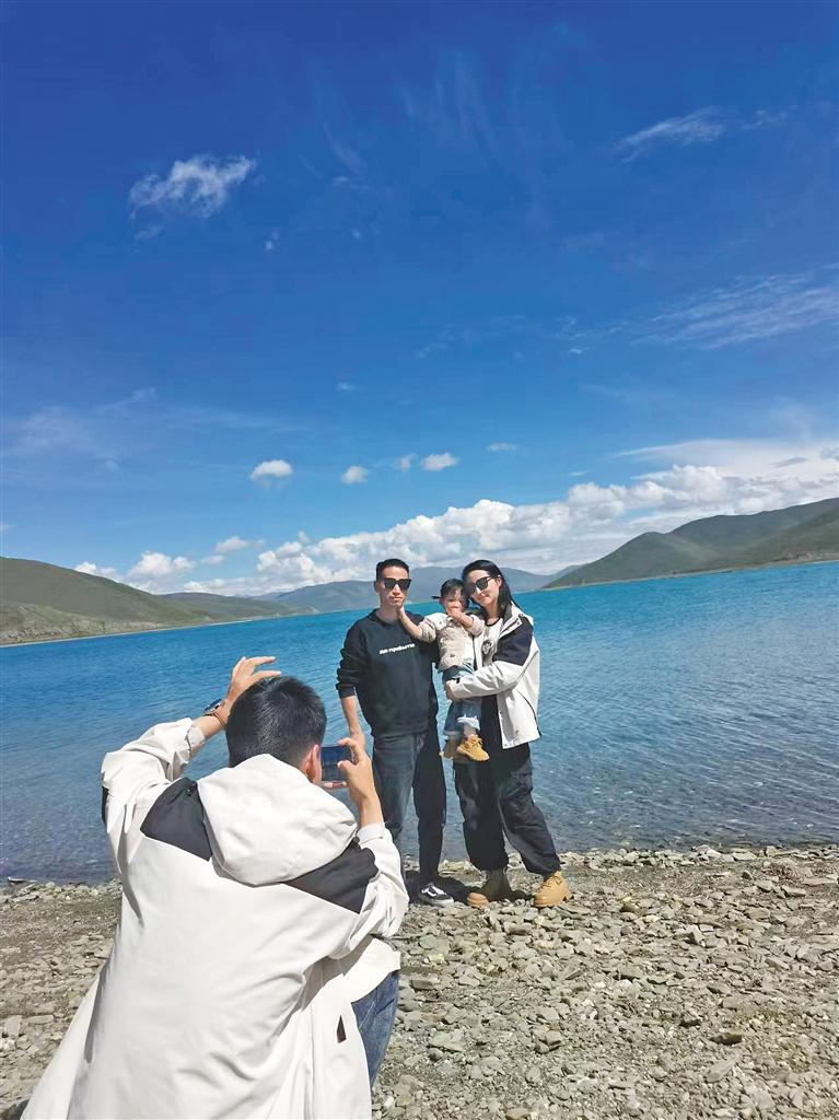 游客在羊卓雍錯拍照留念。記者 張麗萍 攝