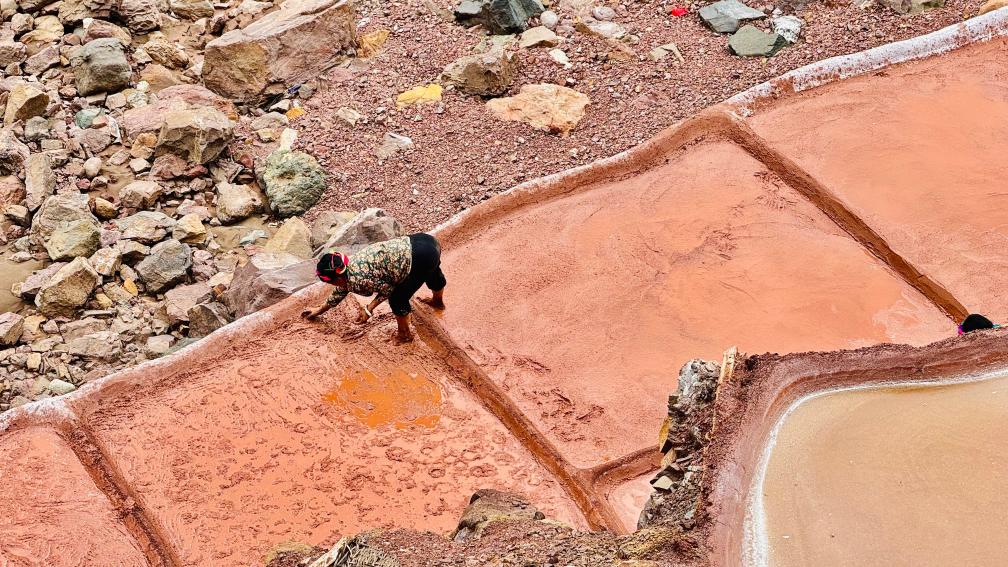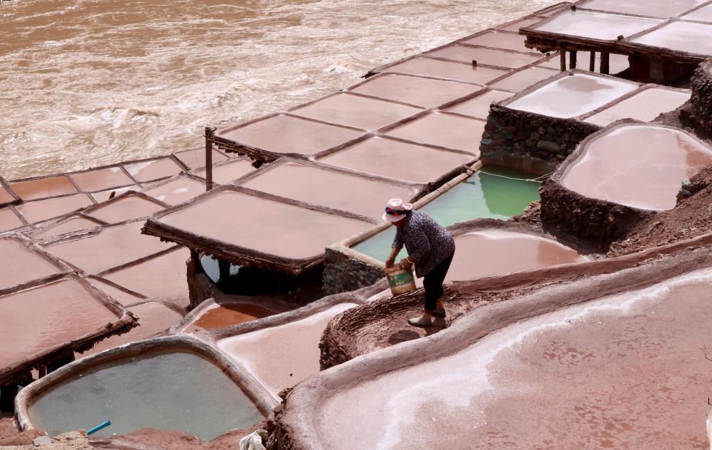 “相傳文成公主進(jìn)藏時(shí)在這里休息。仆從煮水燒茶時(shí),連舀三桶泉水都是咸的?!币环瑒谧骱?,村民扎西拉姆講起故事,“從此人們開(kāi)發(fā)鹽井,在陡坡上層層架木、敷泥澆鹵,形成了鹽田?!?/p>