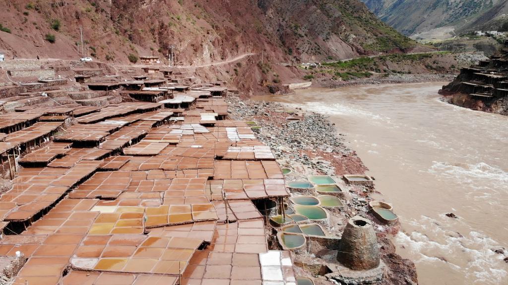一塊塊鹽田橫連縱疊。在礦物質(zhì)和微生物作用下,鹽鹵呈現(xiàn)不同顏色,仿佛山坡上的“調(diào)色盤”。
