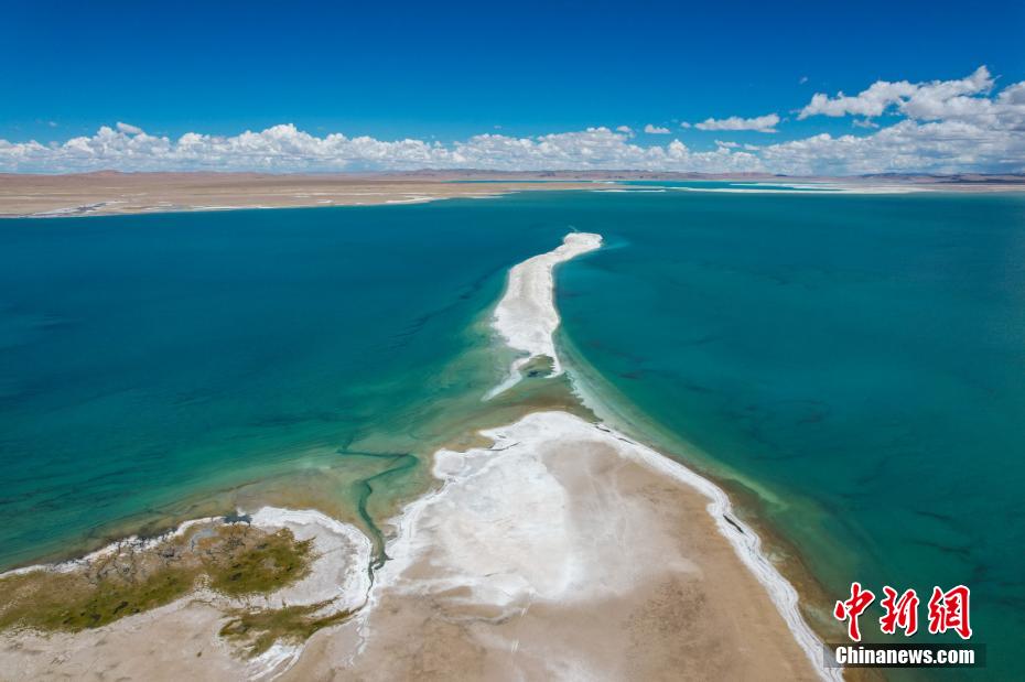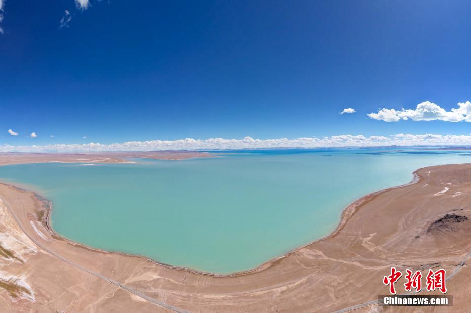 國慶期間,中新網記者自駕西藏藏北羌塘草原,途經“天湖”納木錯,高原鹽湖班戈湖以及西藏第一大湖色林錯等地。秋天高原藍天白云的映襯下,藏北湖泊猶如一面面巨大的“寶石藍”鏡子鑲嵌于高原大地,景色壯麗。圖為10月4日,航拍西藏色林錯水天相接。記者 江飛波 攝