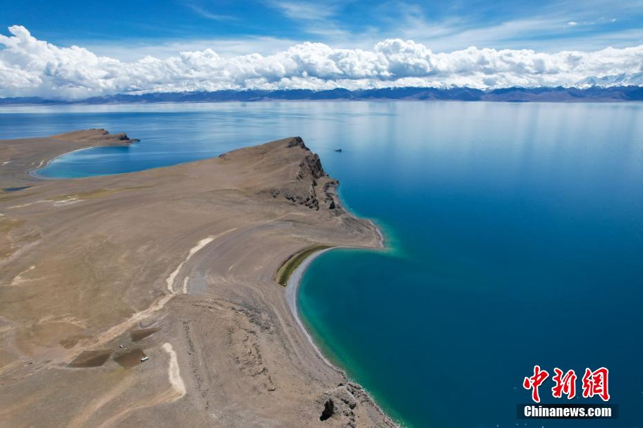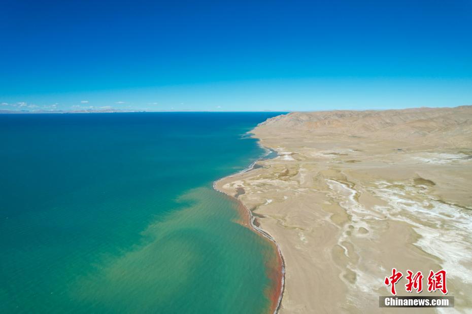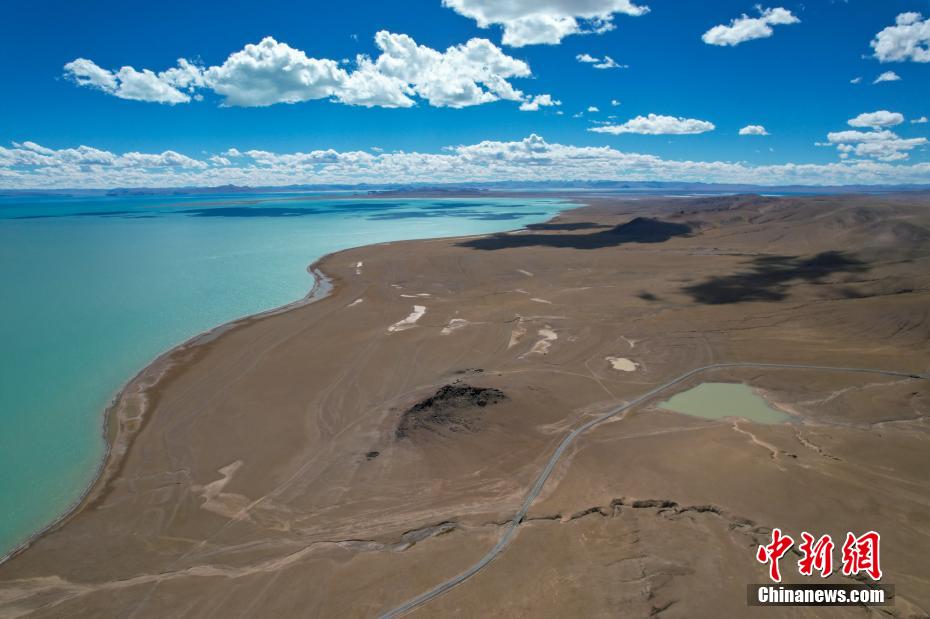國慶期間,中新網記者自駕西藏藏北羌塘草原,途經“天湖”納木錯,高原鹽湖班戈湖以及西藏第一大湖色林錯等地。秋天高原藍天白云的映襯下,藏北湖泊猶如一面面巨大的“寶石藍”鏡子鑲嵌于高原大地,景色壯麗。圖為10月2日,航拍西藏第一大湖色林錯北岸風光。記者 江飛波 攝