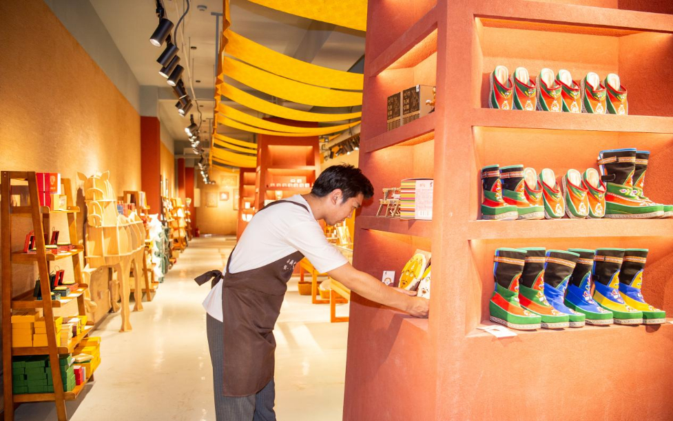 店員在西藏文創(chuàng)集合超市整理產(chǎn)品。