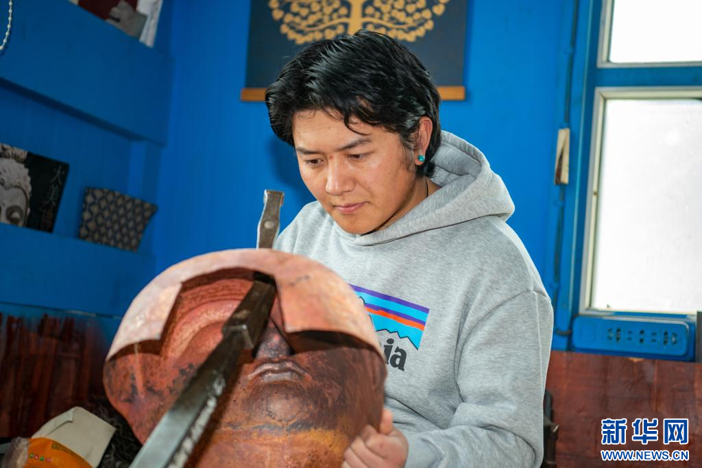 10月17日,西藏昌都市非物質(zhì)文化遺產(chǎn)代表性項(xiàng)目“巴爾瑪錘揲法造像技藝 ”代表性傳承人嘎瑪次仁朗加在打制西藏傳統(tǒng)造像。新華網(wǎng) 旦增努布 攝