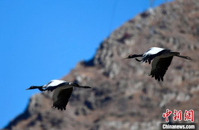 黑頸鶴是全球十五種鶴類中唯一在高原地區(qū)繁殖和越冬的鶴類,被譽(yù)為“高原神鳥”,屬中國(guó)國(guó)家一級(jí)保護(hù)動(dòng)物。每年10月中下旬左右,黑頸鶴陸續(xù)飛抵雅魯藏布江中游河谷等地越冬。圖為11月3日,黑頸鶴在西藏拉薩達(dá)孜區(qū)上空飛翔。中新社記者 李林 攝
