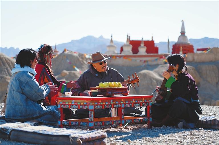 中阮演奏家馮滿天(左)與阿里青年音樂人格瑪扎西(右)在古格遺址腳下即興彈奏。本報(bào)記者 達(dá)珍 洛桑旦增 攝