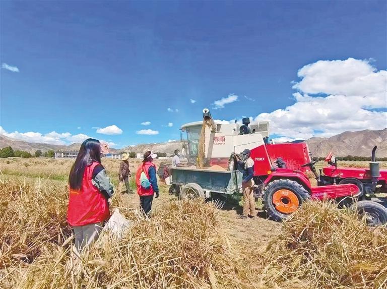 日喀則市各地田間地頭上,到處是繁忙的豐收景象,動人悅耳的“豐收曲”,在希望的田野上悄然奏響——農(nóng)民們正搶抓農(nóng)時,忙碌在田野之間,進行著秋收的收尾工作。隨著現(xiàn)代化機器的日益普及,各類收割機也成了鄉(xiāng)間的“??汀保殡S著機器的轟鳴聲,收割、脫粒、打包、裝運等一系列操作一氣呵成,農(nóng)民們的臉上洋溢著豐收的喜悅。