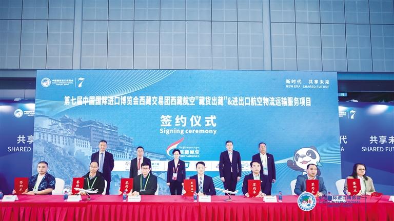 11月5日,備受矚目的第七屆中國國際進(jìn)口博覽會在上海隆重開幕。西藏航空作為西藏自治區(qū)進(jìn)博會交易團(tuán)成員亮相此次進(jìn)博會,并成功舉辦了“藏貨出藏”及進(jìn)出口航空物流運(yùn)輸服務(wù)項目的簽約儀式及推廣活動。本次活動得到了西藏自治區(qū)政府商務(wù)廳的大力支持。西藏航空黨委委員、副總經(jīng)理張兵兵出席簽約儀式。